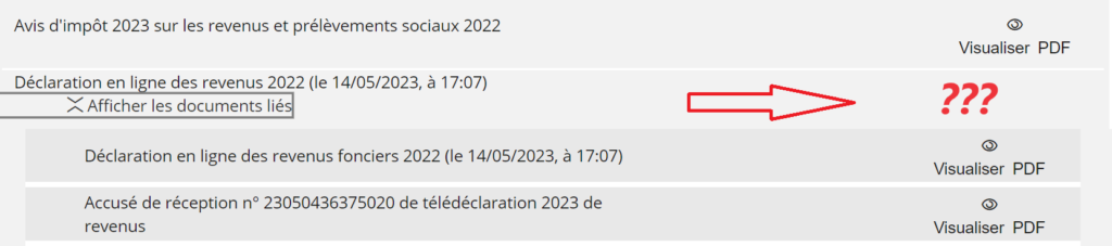 L’avis d’impôt reste disponible tout comme les déclarations annexes (fonciers, plus-value…). Mais impossible de retrouver la déclaration en ligne qui est le document primordial. Vous le savez surement, je propose un service de correction offert des déclarations fiscales passées et il est indispensable de voir la déclaration des revenus 2042. On voit tout ce qui était prérempli, ce qui a été changé, les cases et montants indiqués par le contribuable…