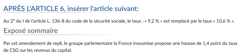 L’amendement adopté est donc une énorme bombe fiscale et de très loin la plus pénalisante pour tout le monde. Ajouter 1.4% de prélèvement sur une taxe inévitable que l’on paie partout représente un énorme manque à gagner pour chaque personne. Mais attention, vous noterez en regardant l’amendement adopté ici qu’il y a une précision : « une hausse de la CSG sur les revenus du capital« .