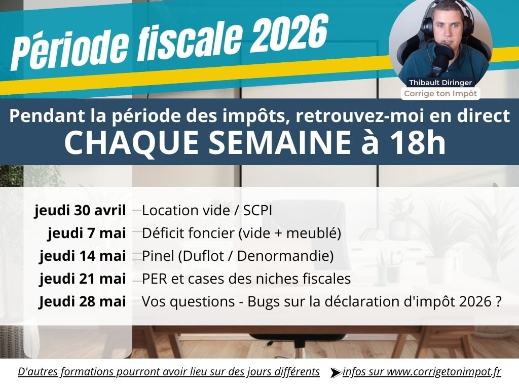 - Jeudi 7 mai à 18h : Déficit foncier en location vide/meublé et correction des bugs sur la déclaration 2026.