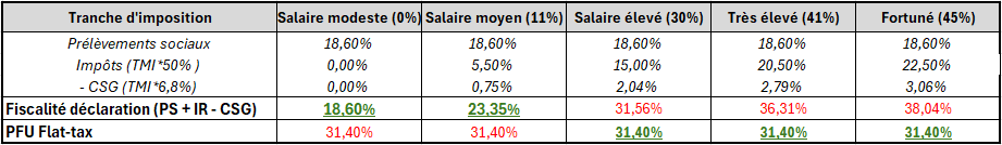 1) Une personne avec une tranche fiscale à 0 % supporte une fiscalité totale de 18.6 % sur les dividendes. Avec le PFU, l’impôt est de 31.4 %.