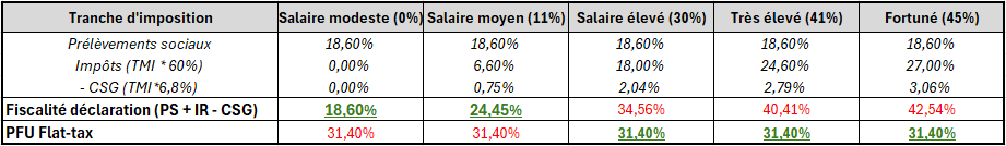 L’abattement sur la TMI est de 50% et les prélèvements sociaux sont dus. Via la flat-tax, c’est 31.4 % à la place du tout.